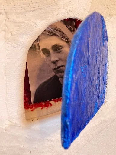 After the heart chakra journey I left there was more to do. I made a plaster gauze heart with a blue door which is reflected also in the Throat Chakra Mandala titled Purpose. The heart is reminiscent of white stucco Mediterranean houses with blue doors on the coast. I made the door so that it can open and close. Inside there is a shelf where I put objects and photos which represent generational, archetypal, ancestral, and relationship healing. I hung the two Mandalas on either side of the heart shaped house box and photographed some of the objects inside. When I stepped back and looked at the entire installation, I realized it looked like a womb in the center with ovaries on either side.