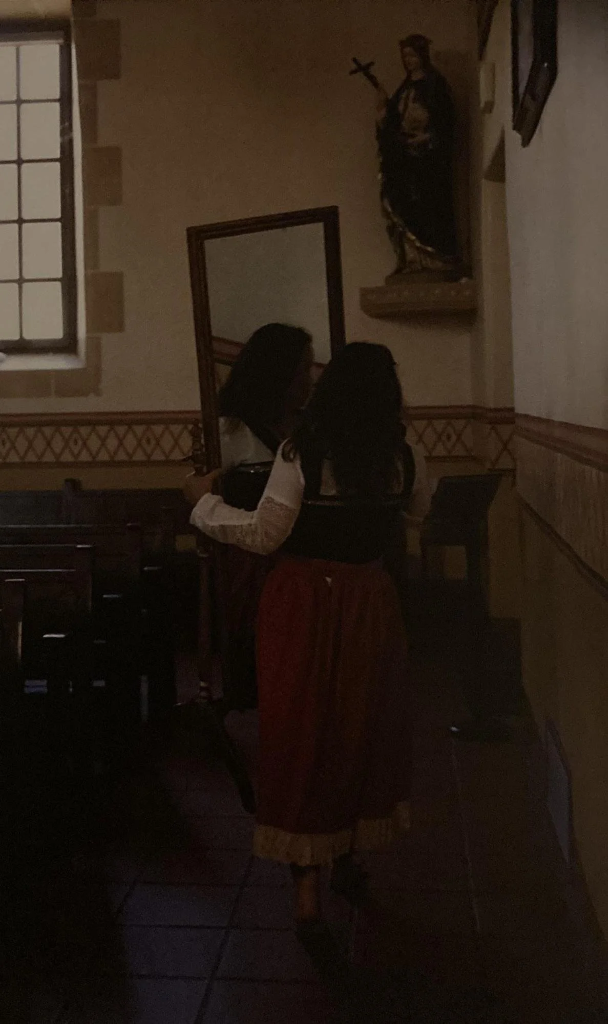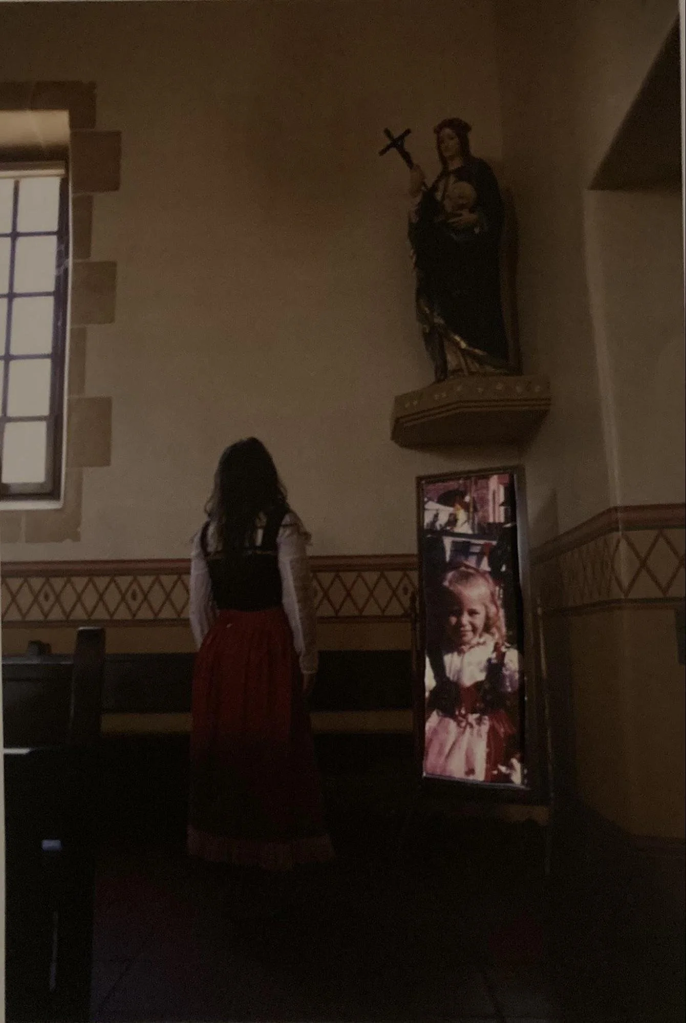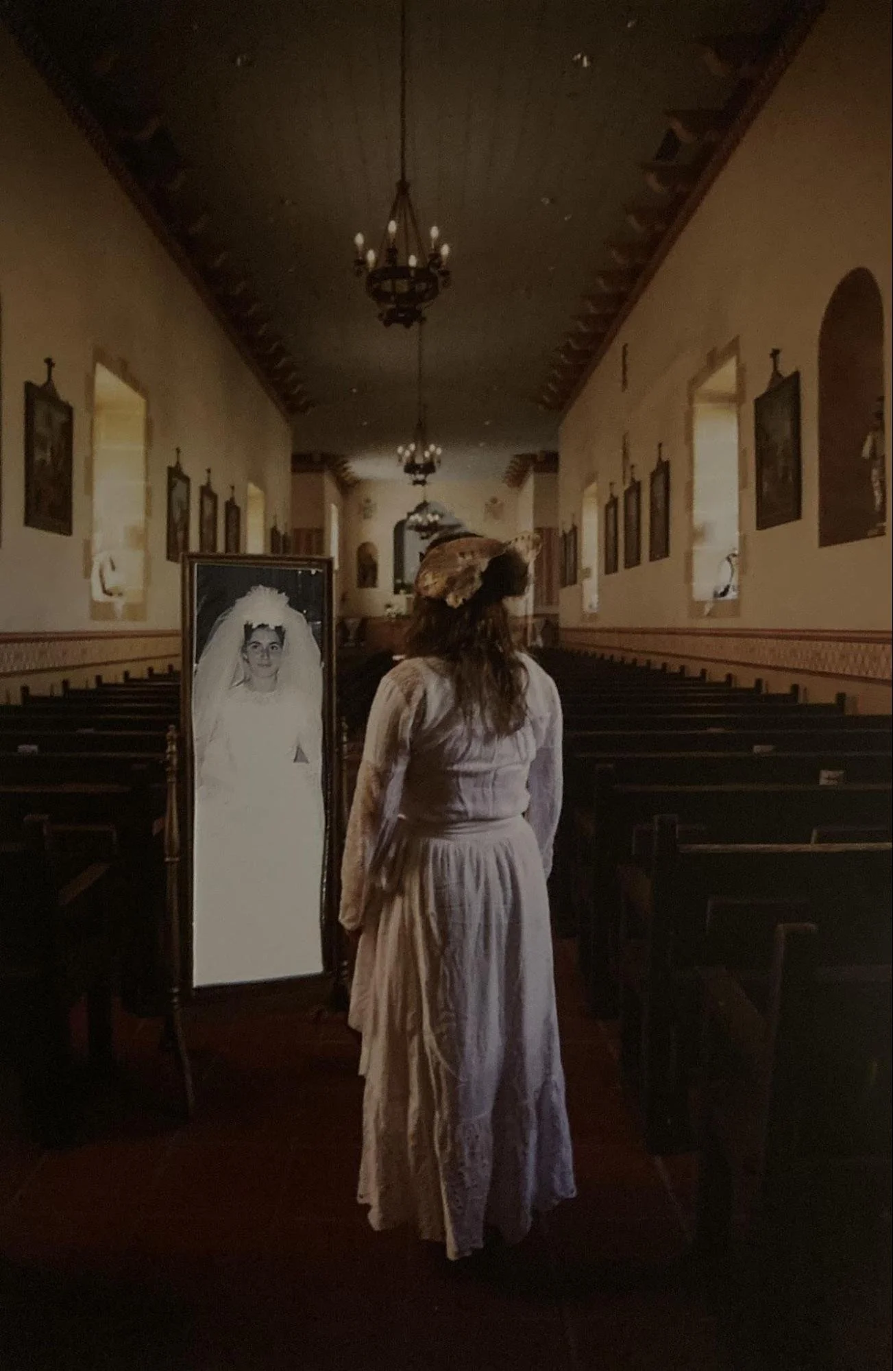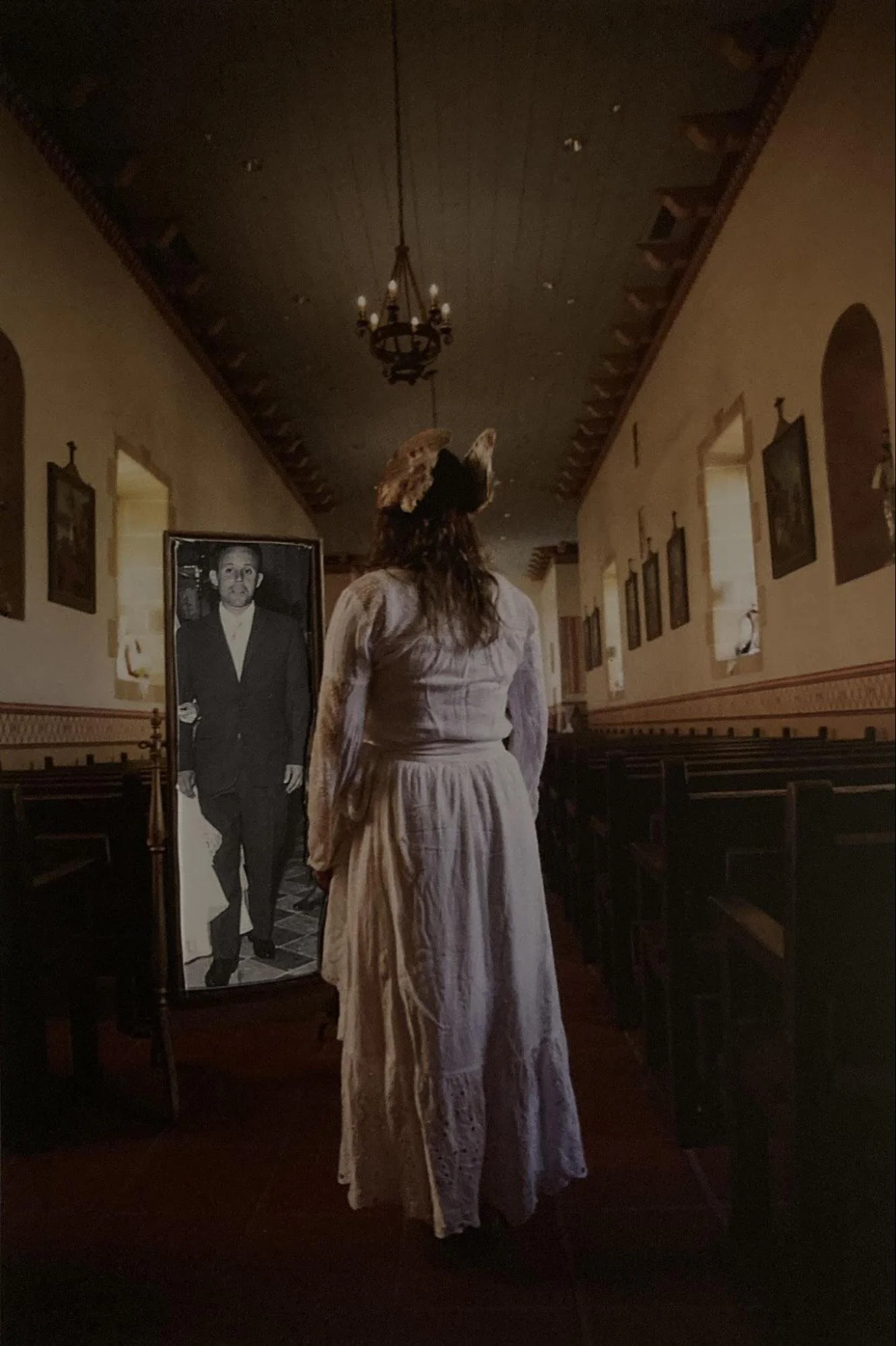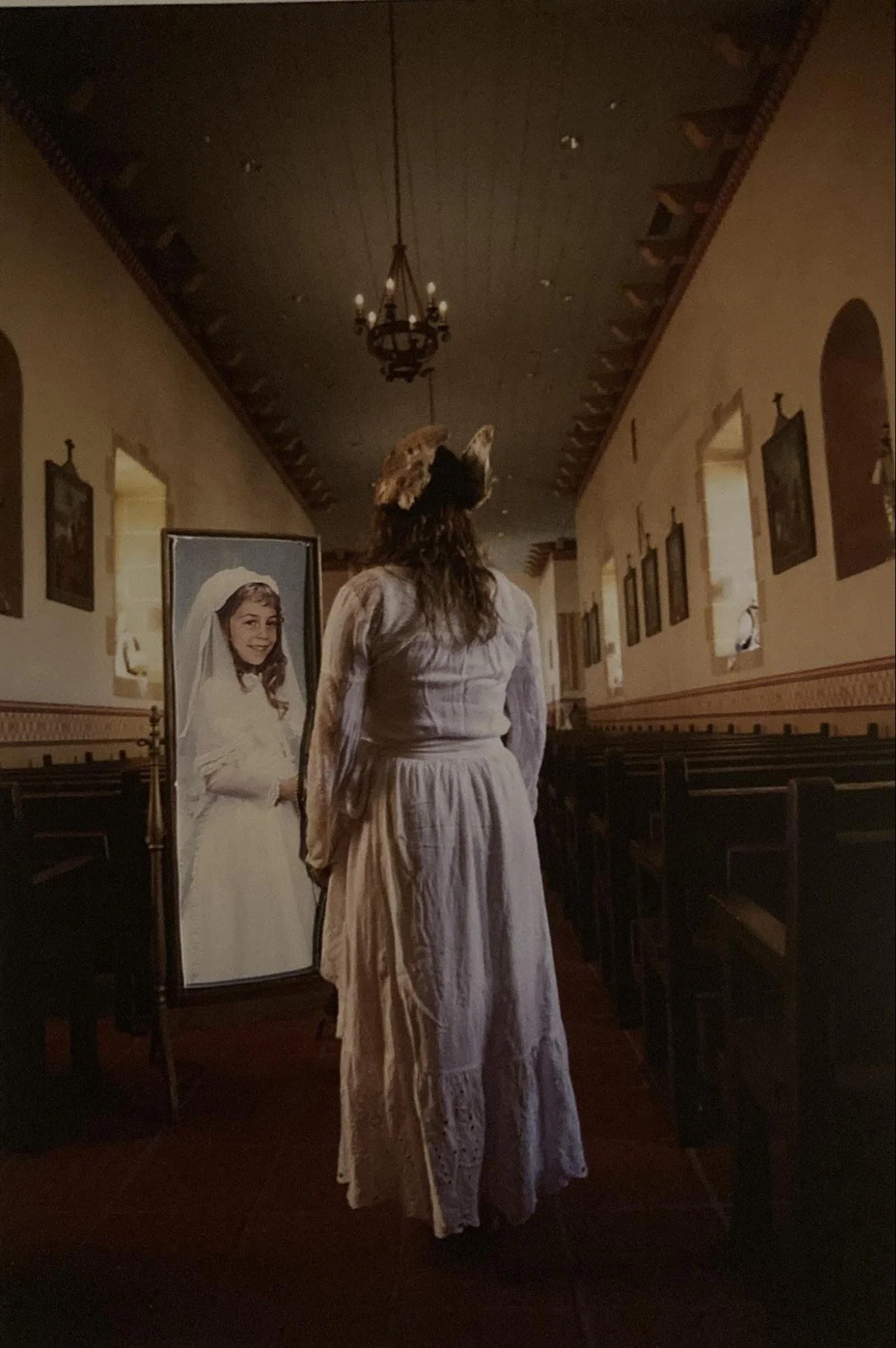 The first series is taken in our family church. I am dressed in ceremonial white with an owl-wing headdress. The images reflected are my parents on their wedding day, and myself in my holy communion dress. Photographs by Michelle Robertson.