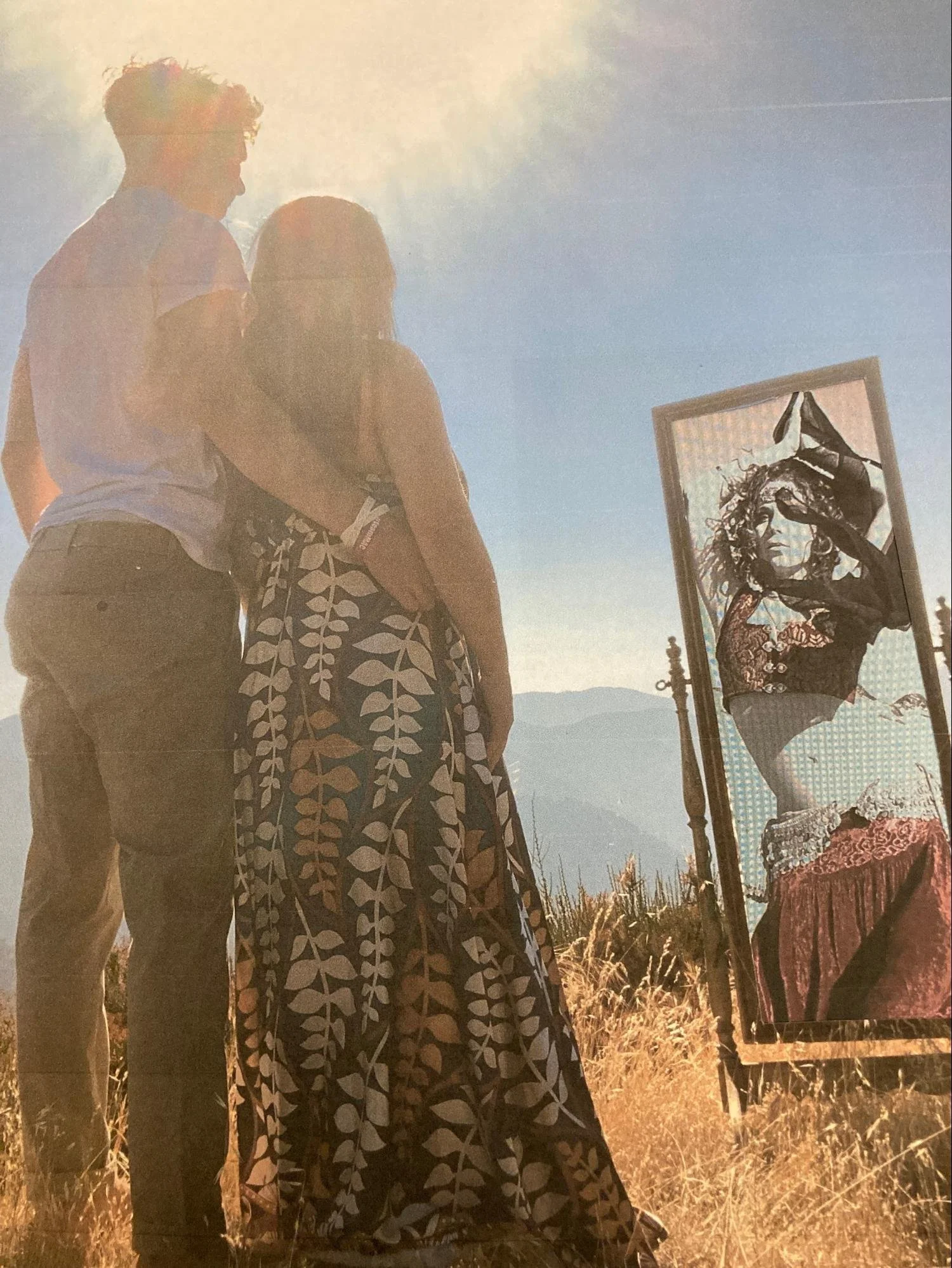 My exploration of the mirror as metaphor and myths as roadmaps to personal rites of passage have opened up a portal of personal story telling. In 2022 I experimented with my Nonna’s mirror as a way to capture ancestral story. I am photographed looking into the mirror, I then replaced the image of myself reflected in the mirror with images of family and myself as a child.